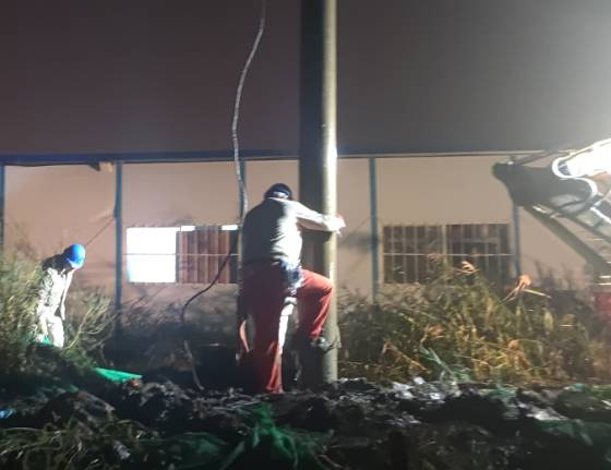 今年的10月天氣還是熱的厲害,電桿被太陽曬的滾燙,搶修人員臉上掛滿了豆大的汗珠,工作服已經(jīng)全部濕透。為了搶時(shí)間,抓進(jìn)度,作業(yè)人員們?nèi)徊活櫍廊痪o張有序地工作著?,F(xiàn)場搶修工作涉及吊車、挖掘機(jī)等大型施工機(jī)具,安全管控尤為重要,現(xiàn)場所有搶修人員在工作負(fù)責(zé)人的指揮下平穩(wěn)有序的推進(jìn)搶修工作,吊車擺放位置、挖掘機(jī)挖桿洞的位置等每一個(gè)關(guān)鍵工作點(diǎn)都在搶修人員的嚴(yán)格監(jiān)督下進(jìn)行,不敢有絲毫松懈。就在這時(shí),天公不作美,突然下起了大雨,可是大雨并沒有攔住搶修工作。臺(tái)北供電所現(xiàn)場所有的搶修人員在錢所長的帶領(lǐng)下,穿著濕透的工作服在雨中指揮挖掘機(jī)開挖桿洞、組立電桿、連接導(dǎo)線-------搶修人員在天昏地暗的雨中穿梭,雨水和汗水交匯在電力搶修人員的臉龐上,大家都來不急擦拭一下臉上的雨水,在雨中忙碌著。經(jīng)過4個(gè)半小時(shí)的緊張有序搶修,晚上19:30分10KV港北線恢復(fù)供電。