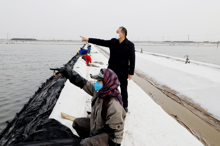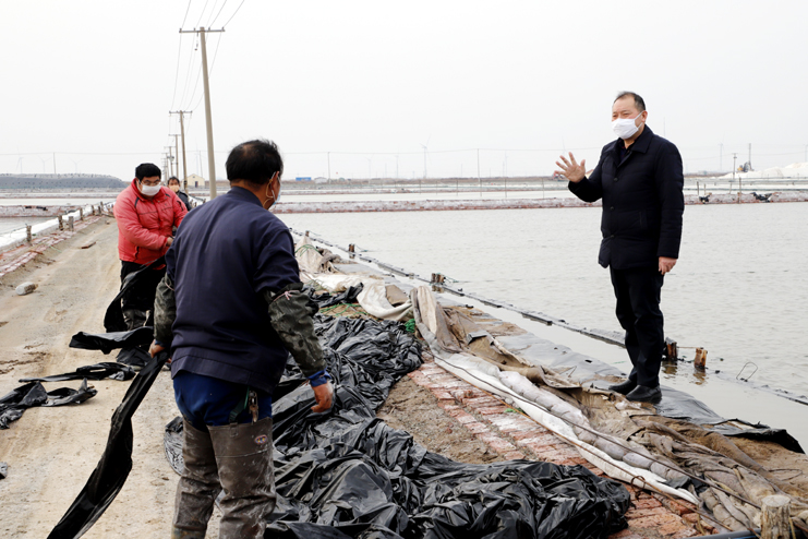 李國(guó)文首先來到日曬制鹽公司生產(chǎn)灘頭,現(xiàn)場(chǎng)察看復(fù)工復(fù)產(chǎn)情況。徒步灘頭,有的在補(bǔ)塑布、有的在修整廩基、有的在更換塑布,每個(gè)班組都在搶抓時(shí)間準(zhǔn)備春扒工作。隨后李國(guó)文先后前往西旺養(yǎng)殖池塘、明威田頭、宵洋物流碼頭,每到一處都詳細(xì)詢問職工口罩、消毒酒精等防護(hù)物資夠不夠用,有沒有外地回來的員工,并叮囑員工少接觸外地回來人員,錯(cuò)開上下班時(shí)間,外出要帶口罩,保護(hù)好自己才能更好的為企業(yè)創(chuàng)造效益。