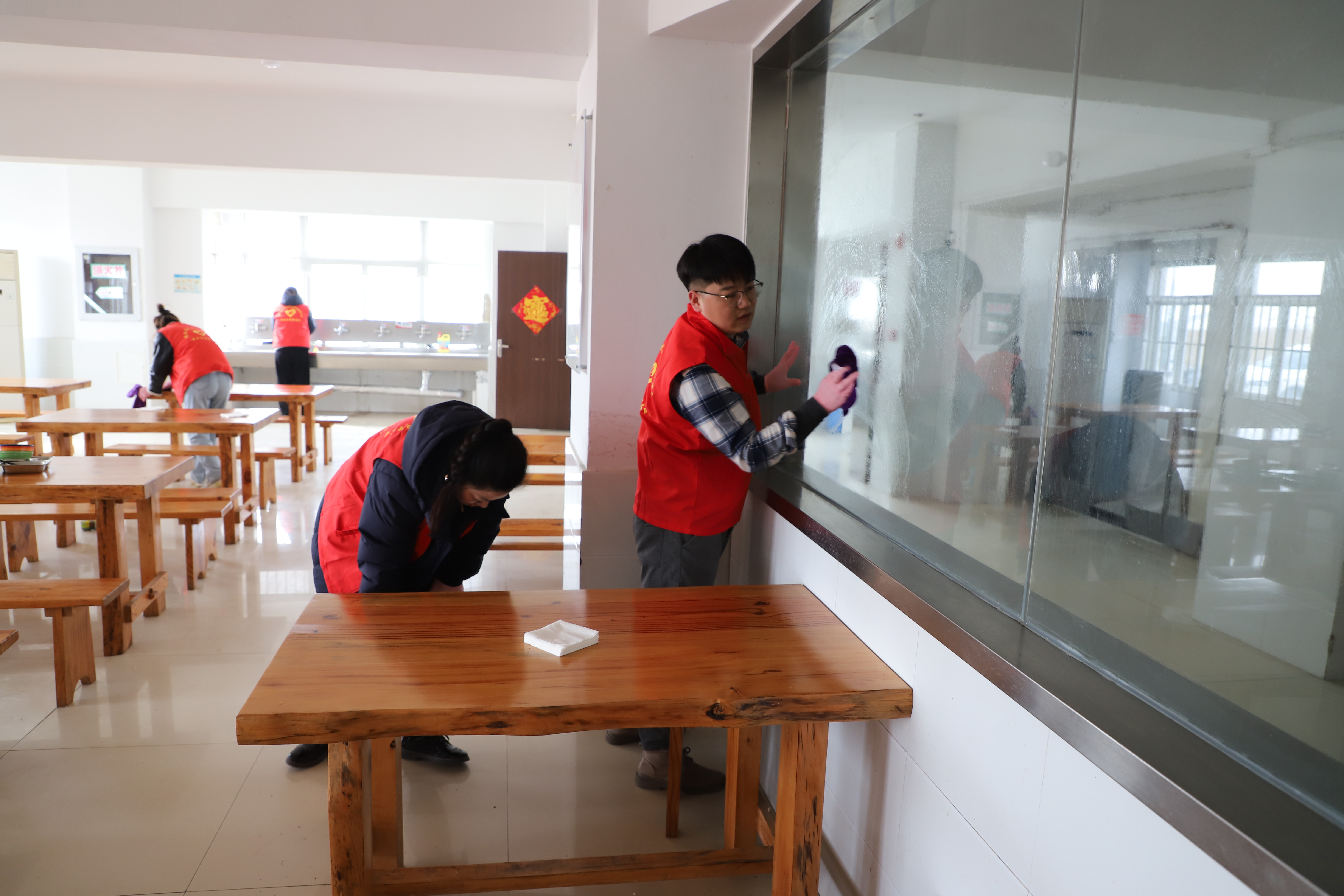 在食堂里隨處可見(jiàn)的志愿者兢兢業(yè)業(yè)的忙碌著,他們不怕臟,不怕累,不遺漏任何衛(wèi)生死角,他們分工合作,有的擦窗,有的抹地,有的清掃垃圾,干勁十足,呈現(xiàn)出一派熱火朝天的勞動(dòng)場(chǎng)面。經(jīng)過(guò)兩個(gè)小時(shí)的辛勤勞動(dòng),食堂環(huán)境煥然一新。(西團(tuán))