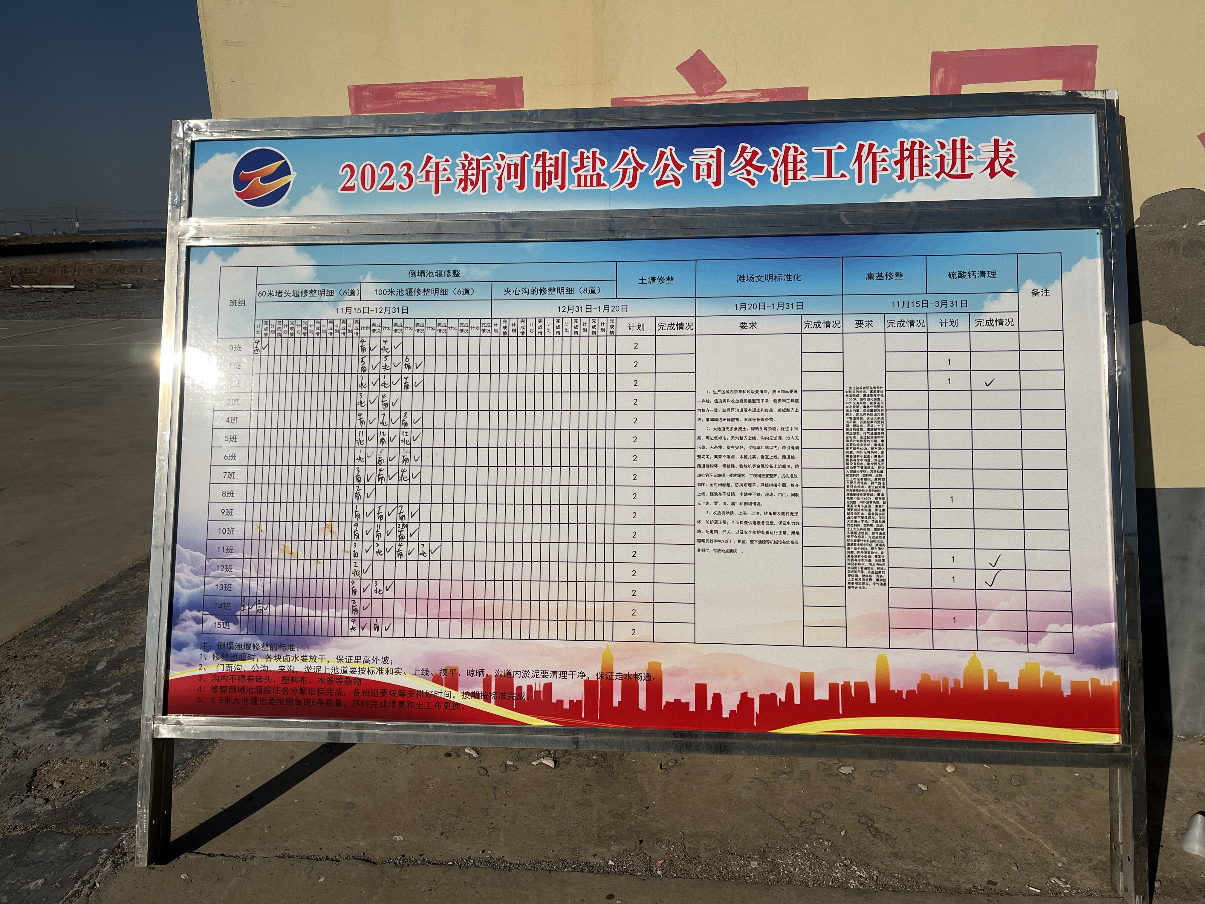 冬季是日曬制鹽收儲(chǔ)鹵水、扒土塘、整理灘場(chǎng)文明的最佳時(shí)期,也是為2024年工作起好頭、邁好步的關(guān)鍵時(shí)期,自冬準(zhǔn)工作開展以來(lái),新河制鹽分公司制定冬準(zhǔn)工作推進(jìn)表,掛圖作戰(zhàn)按時(shí)推進(jìn)冬準(zhǔn)進(jìn)度。