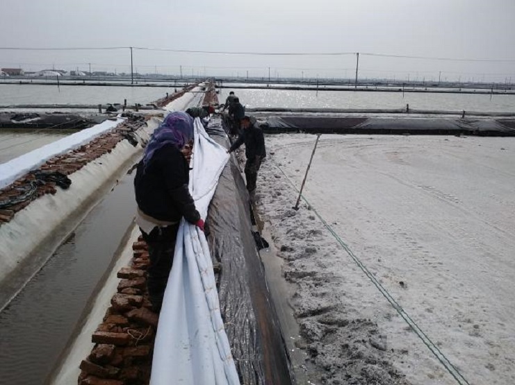 新河制鹽分公司為了盡快改善食用鹽基地面貌,減少池埝上固化紅磚風(fēng)化,沙塵落入鹽池內(nèi),對(duì)池鹽的污染,近期組織分公司職工,對(duì)基地塑池的紅磚固化池埝進(jìn)行處理,先用黑塑布把池埝重包一遍,然后再用土工布苫好。有效地減少了雜物落入池鹽中,為產(chǎn)合格食用鹽提供了良好生產(chǎn)環(huán)境。(圖為職工們正在苫蓋紅磚固化池埝。)