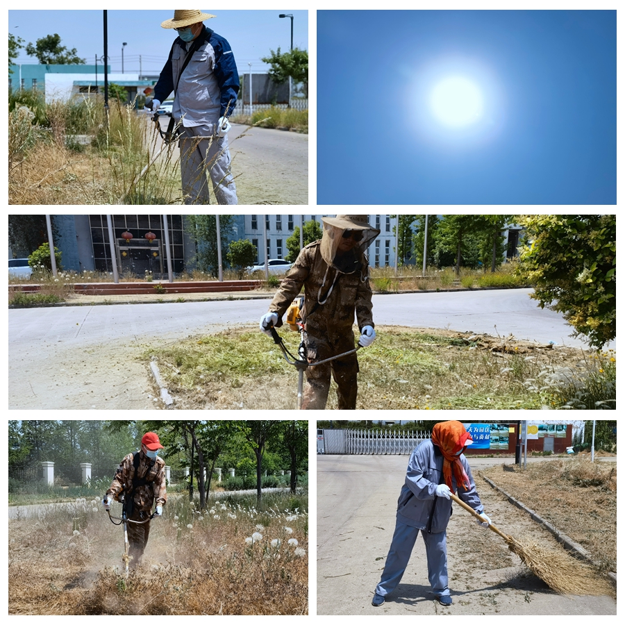頭頂著炎炎烈日、忍受著蚊蟲叮咬,大伙使用打草機(jī)、鐮刀等工具,對(duì)雜草、高草進(jìn)行割除。走近細(xì)看,他們的臉上和手臂上都布滿,衣服早已濕透貼在身上。除草過程中,草渣紛紛濺到他們的身上,但這絲毫沒能影響他們工作的節(jié)奏。伴隨著機(jī)器的轟鳴聲,一片片規(guī)格一致、邊緣平直的綠草坪映入眼簾,淡淡的清香綠草味撲鼻而來,整個(gè)綠地充斥著整潔的氣息。