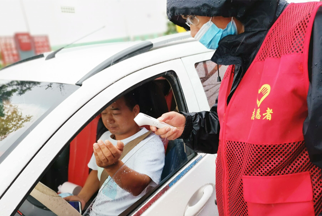 “您好,請出示一下行程碼,做下登記?!眻?jiān)守在崗位,逆風(fēng)迎雨,對車輛進(jìn)行逐一登記和體溫檢查,絲毫沒有受天氣的影響。