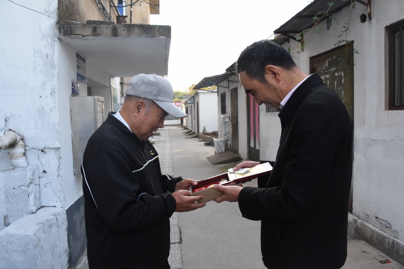 解韻波同志今年83歲,1956年1月參軍,那年19歲,同年6月經(jīng)過(guò)短期高強(qiáng)度培訓(xùn),作為無(wú)線電通訊兵出國(guó)抗美援朝。1959年西藏達(dá)賴集團(tuán)發(fā)動(dòng)叛亂,剛回國(guó)不久的解韻波作為無(wú)線電技術(shù)兵種隨即跟隨大部隊(duì)入藏平叛。至今他仍保留著抗美援朝軍功章,入藏平叛軍功章、紀(jì)念章等。1962年退伍分配至臺(tái)北鹽場(chǎng)工作,1997年退休。今天慰問(wèn)的時(shí)候,在鄰居們的簇?fù)砗推G羨之中,還沒(méi)進(jìn)家門,鄰居們就迫不及待地要求打開“紀(jì)念章”一睹風(fēng)采。紀(jì)念獎(jiǎng)?wù)聮煸诶蠎?zhàn)士胸前,一眾鄰里夸贊不斷:這份榮譽(yù)沉甸甸的。這份榮譽(yù)是拿命換來(lái)的。這是不得了的榮譽(yù)啊。這樣的老兵是我們的寶貝哦,我們要尊敬啊。……就在小區(qū)活動(dòng)廣場(chǎng)上,老戰(zhàn)士與大家暢談起保家衛(wèi)國(guó)光榮的戰(zhàn)斗經(jīng)歷,烽煙往事歷歷在目。退伍后,不褪軍人本色,幾十年如一日立足家鄉(xiāng)建設(shè),為臺(tái)北鹽場(chǎng)奉獻(xiàn)青春,為國(guó)家建設(shè)貢獻(xiàn)力量。大家對(duì)解韻波老戰(zhàn)士的革命戰(zhàn)斗和建設(shè)祖國(guó)的歷程表示由衷贊嘆和敬佩。