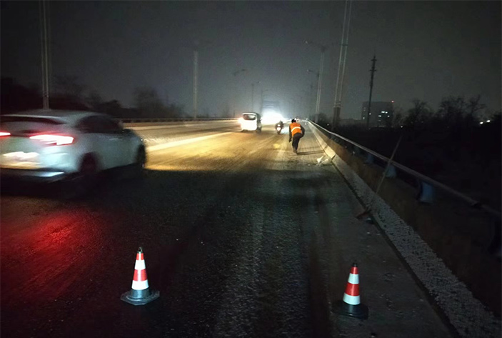 該公司除雪突擊隊(duì)由總經(jīng)理徐習(xí)華和副總王利分頭帶隊(duì)指揮,集結(jié)了安全部、管養(yǎng)部、綠化、保潔、市政、環(huán)衛(wèi)的突擊隊(duì)員80余名,出動(dòng)5輛皮卡車、3輛皮卡、1臺(tái)裝載機(jī)和2輛巡查車,主要負(fù)責(zé)新區(qū)內(nèi)橋梁、連云開(kāi)發(fā)區(qū)橋梁、徐新路、疏港大道、228省道等主要交通干道布撒融雪劑抗凍救災(zāi)工作。突擊隊(duì)員在進(jìn)行融雪劑撒布作業(yè)的同時(shí),及時(shí)清理路面融化雪水,防止再次結(jié)冰,各除雪設(shè)備配合作業(yè),階梯式向前推進(jìn),提高除雪效率。(李敏 王宜全)